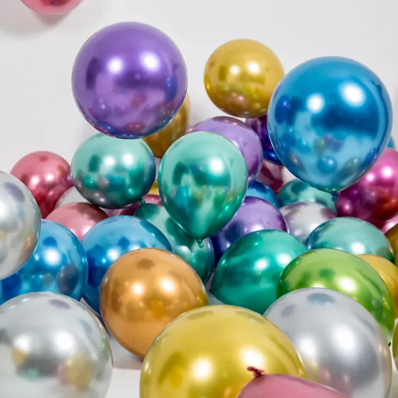 Funkce: Řada populárních kovových barev, jako je zlato, stříbro, růžové zlato, bronz atd., 10 palcové chromové latexové balóny jsou plné barev a vysokého lesku.