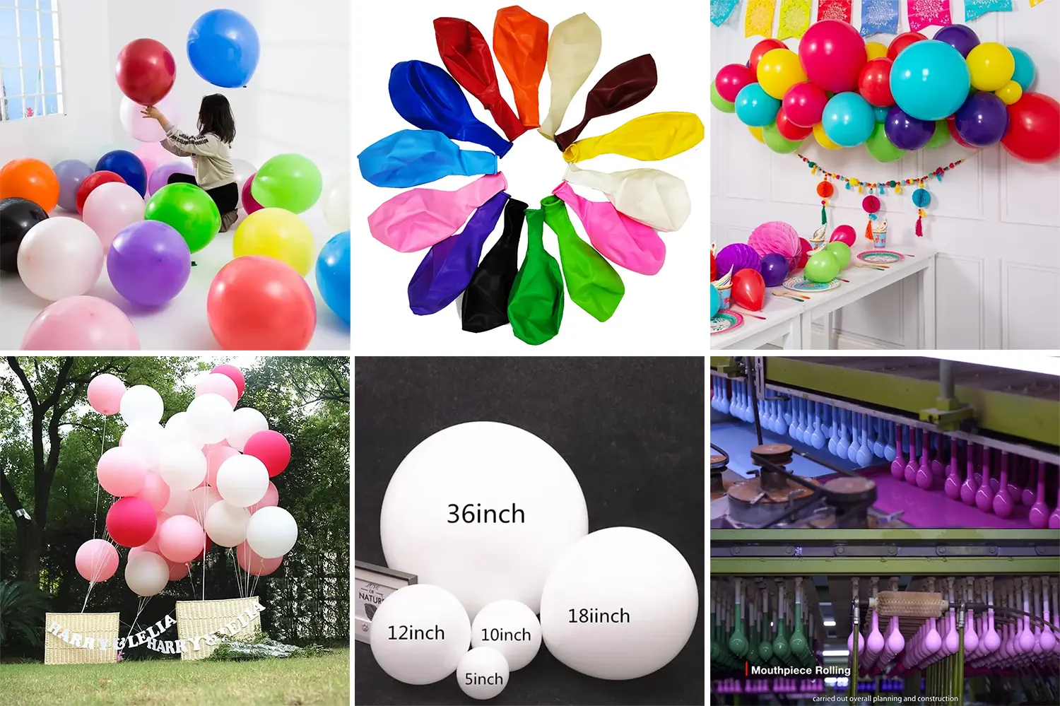 Mezi produkované typy balónů patří různé velikosti (5, 10, 12, 18, 36 palců), tvary (kulaté, srdce, raketa, oblátek, krystaly) a speciální efekty (matné, lesklé, perleťové, kovové, tištěné, flitry/peří), aby splňovaly vaše 18 palcové matné balóny.
