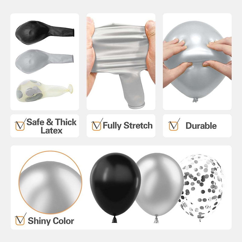 Celkově vzato, černá a stříbrná dohromady znamenají spojení rozumu a snů. Jsou klidné, ale mají pěkné melíry. Nejsou okázalé, ale vyzařují luxusní pocit. Sada černostříbrných balónkových girland není jen dekorace. Ukazují také jakýsi styl. Na jakémkoli místě dokážou vyslat eleganci, moderní atmosféru a sílu. Dodávají akci pěknou slavnostní náladu. Hodí se na romantické svatby, módní večírky nebo firemní akce. Narozeninové sady černostříbrných balónkových girland mohou být hlavním zaměřením se svým zvláštním kouzlem. Díky nim každý host zažije jedinečný zážitek z oslavy.