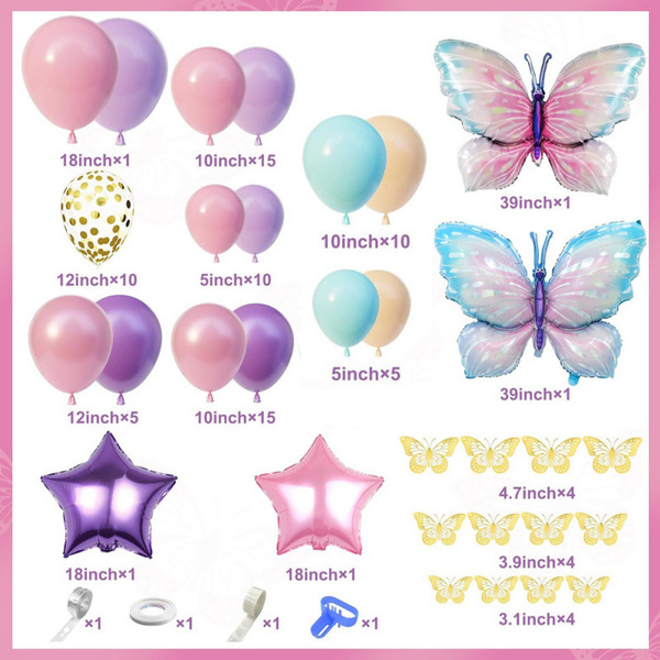 Sada motýlkových věnečků obsahuje hlavně latexové balónky, které se dodávají v různých velikostech (5 palců, 10 palců, 12 palců a 18 palců). V jejich barvách obvykle dominuje růžová, modrá, fialová atd. Pro umocnění efektu vrstvení stavebnice můžete vidět také průhledné latexové balónky a konfetové latexové balónky. Jako téma stavebnice jsou nepostradatelné i fóliové balónky s motýlky. Většina jejich barev je jasná (modrá/růžová/fialová...) a průměrná velikost je 18-30 palců (s dostupnými vlastními velikostmi). Navíc mají velmi realistický vzhled, který je téměř jako živý.