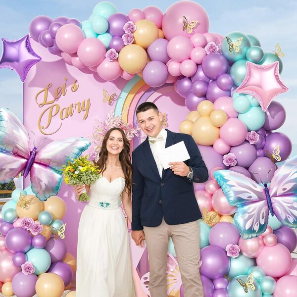 Oblouková sada motýlků: Oblouková souprava je barevná a poutavá, skládá se z různých fóliových balónků a latexových balónků. Při uspořádání přidejte desku pozadí se vzory a různým textem a pak kolem ní obklopte balónky. Je tvůrcem atmosféry na akci. Focení před ním bude vypadat velmi krásně.