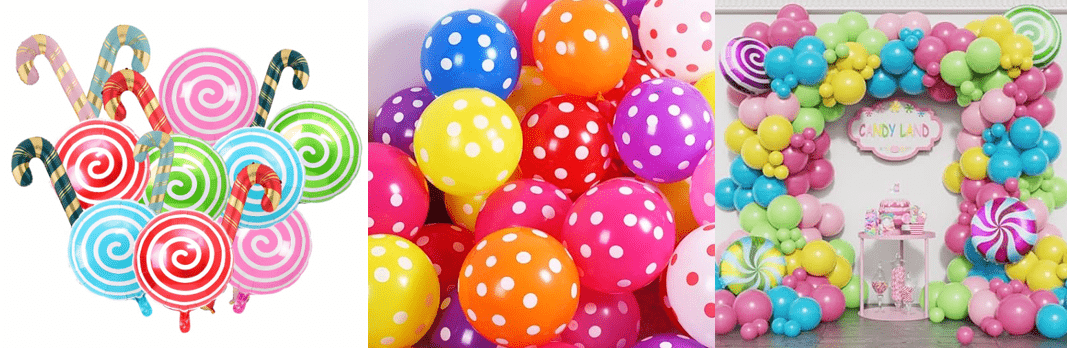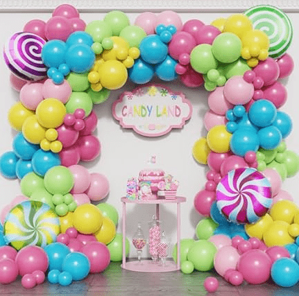 Sada balónkových girland na téma Candy s bonbónovou barvou sladkých snů a roztomilým tvarem lízátka jako základními designovými prvky, celkový styl je živý a sladký.