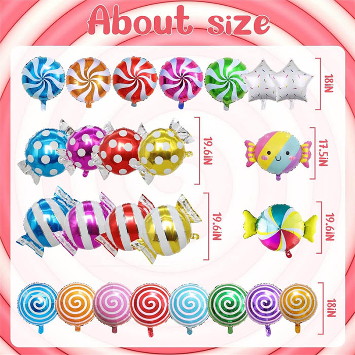 Balóny bonbónů série série jsou v současné době k dispozici v různých barvách a stylech a vytvářejí novou dekoraci večírku s tematikou cukrovinek pro dospělé, děti, chlapce, dívky a lidi všech věkových skupin. Světlé a barevné vánoční bonbóny tematické balóny, roztomilé lollipop tematické party fólie fólie balón oblek je roztomilý doplněk k vaše narozeninové tématické dekoraci večírku. Candy fólie balón se dokonale shoduje s dalšími dekoracemi večírku na bonbóny a vytváří krásný dárek, pozadí a fotografické rekvizity pro přátele, kteří mají rádi lízátka.