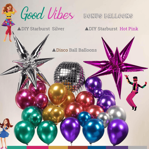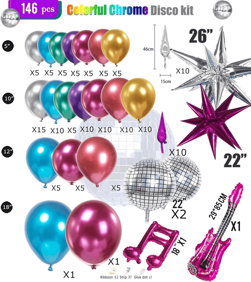 TheOblouková sada disco balónuse skládá hlavně zbarevné latexové balónky arůzné fóliové balónky. Aby byl vytvořen styl lesklého chromu, námi poskytované latexové balónky jsou metalické latexové balónky, jejich povrchy mají velmi krásný kovový lesk a mohou dosahovat vynikajících výsledků v interiéru i exteriéru. Jejich velikosti jsou 5 palců, 10 palců, 12 palců a 18 palců.