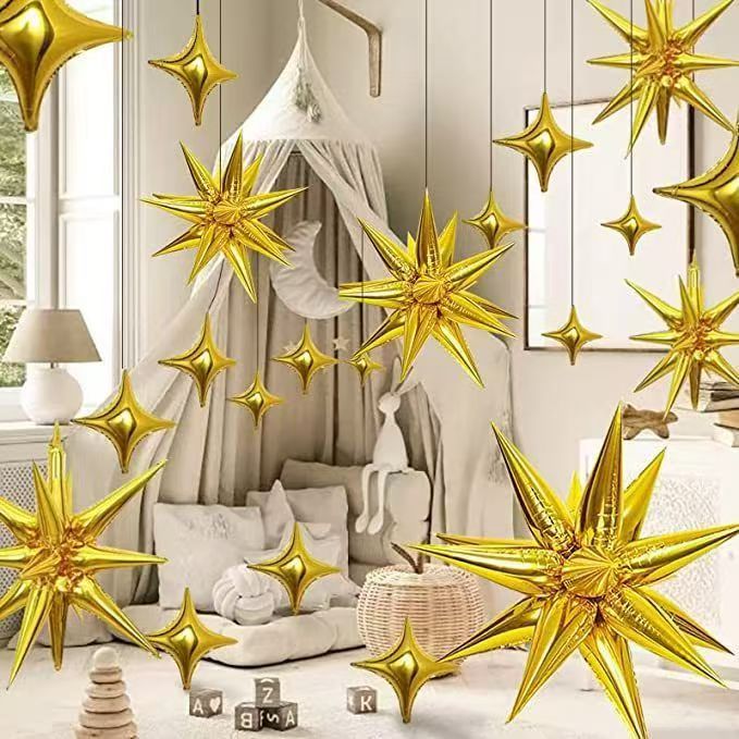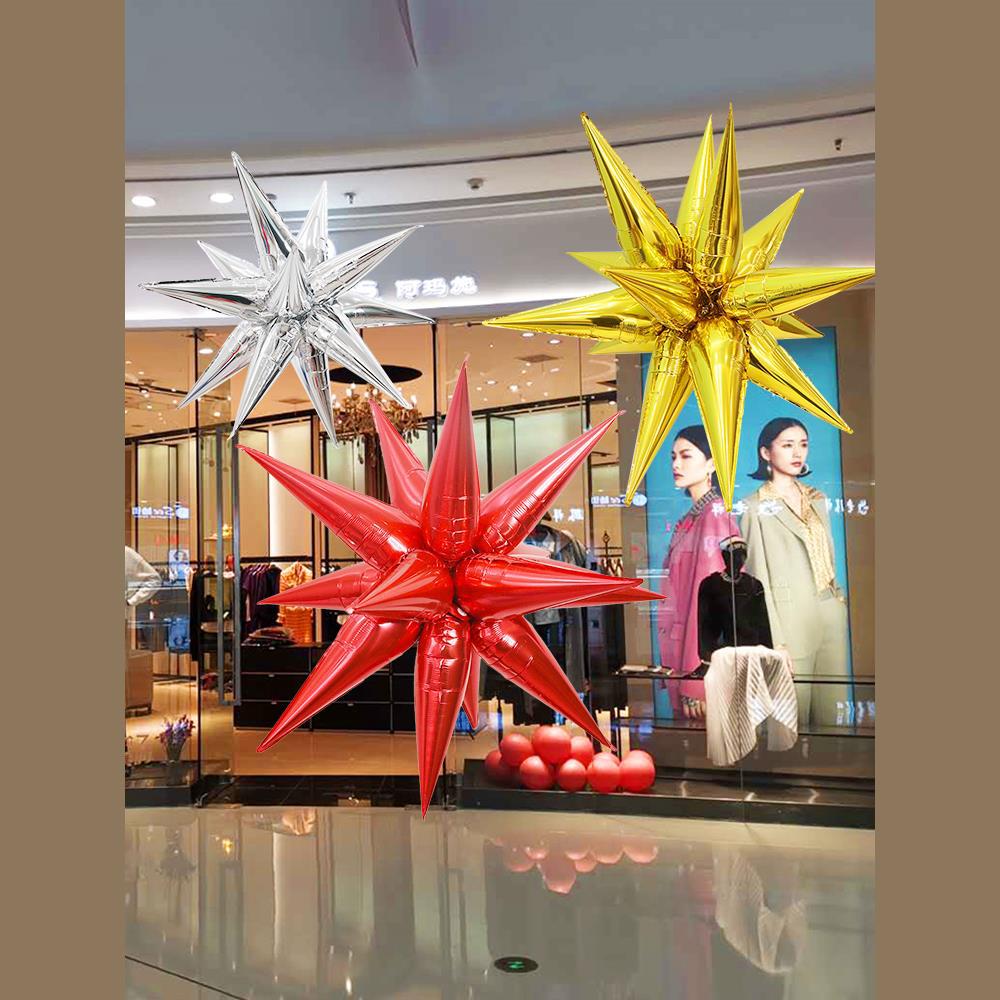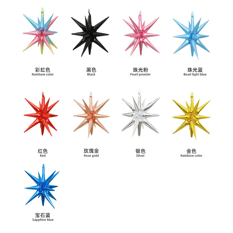 Jednorázové explodující hvězdné fóliové balóny: K dispozici ve dvou velikostech: 22 palců a 27 palců. Velikost 22 palců je menší a vhodná pro ložnice a kanceláře, takže je ideální pro výzdobu narozenin. 27palcová velikost je vhodnější pro větší prostory, jako jsou banketové haly a okna nákupního centra. I když je zavěšený vysoký, vzorec lze jasně vidět.