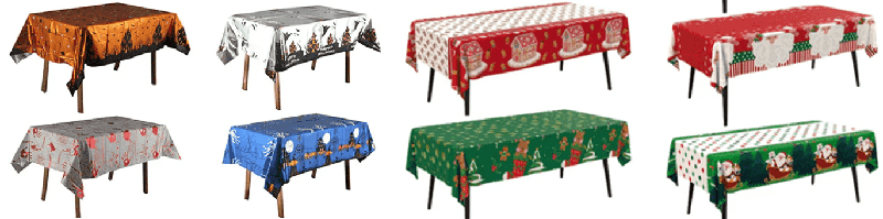 Například červené a zelené barevné sladění vánočního motivu, fóliový ubrus s vánočním stromečkem a vzorem sněhových vloček, černo-oranžové barevné sladění halloweenského motivu s dýňovým a netopýřím vzorem a červeno-zlaté barevné sladění jarního motivu se šťastnými postavičkami a vzorem lucerny lze použít pro sváteční výzdobu plochy domácností, nákupních center, barů, restaurací a dalších míst.