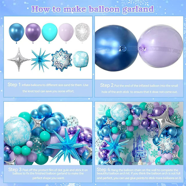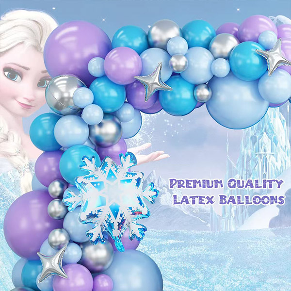 Kromě běžných balónů zahrnuje souprava mnoho prvků ve tvaru témat. Existují velké fólii sněhové vločky. Mají jemné textury. Jsou jako magické sněhové vločky vytvořené Elsou ve filmu. Můžete je použít k vytvoření oblouku. Můžete je také použít k ozdobení stěny pozadí. Tyto barvy se mísí dohromady. Okamžitě vytvářejí atmosféru, jako je být v ledu a sněhu.