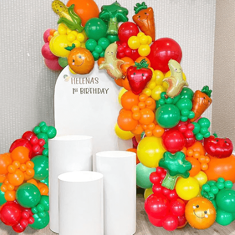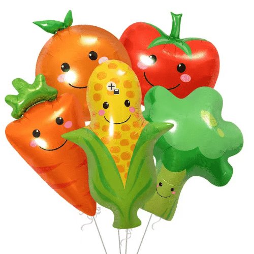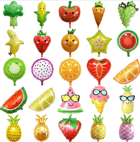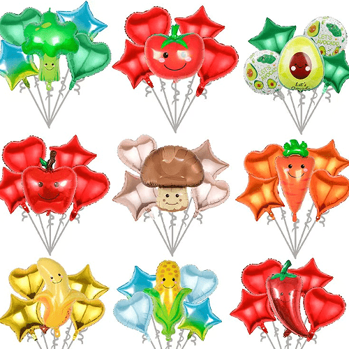 Sada fóliových balónků: Použijte řadu různých fóliových balónků na zeleninu a ovoce, které se spojí a vytvoří ovocný talíř nebo motiv motivu zeleninové zahrady. Například balonky s melounem, jahodami, pomeranči, banány a dalšími balónky, které vytvoří živou atmosféru s ovocnou tématikou.