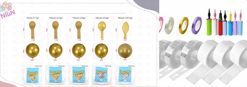 Sada oblouků má 5palcové, 10palcové, 12palcové, 18palcové nebo 36palcové balónky. Kombinace těchto různých velikostí vám umožní snadno vytvořit balónový oblouk s plným a vrstveným vzhledem.