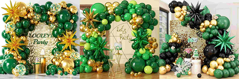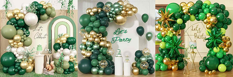 Když se matná zelená, tmavě zelená a další zelené balonky mísí se zlatou, různé odstíny zelené působí jako život v lese a staromódní elegance zachycená v oblouku. Zlato září jako sluneční světlo, díky čemuž je celá barva jasnější. Měnící se zelená udržuje oblouk živý a kovová zlatá změkčuje závažnost zelené. Výsledek působí přirozeně, bohatě a efektně a hodí se k mnoha retro party scénám.