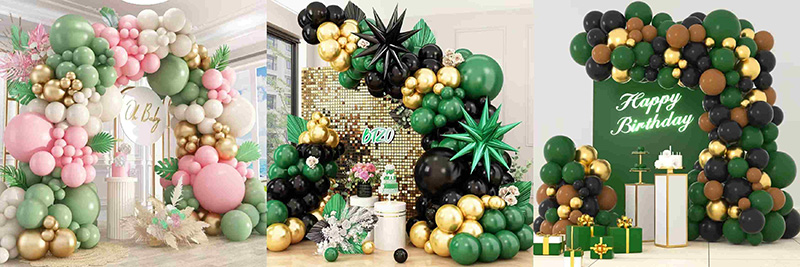Můžete použít bílé nebo hruškově bílé balónky se zeleným a zlatým balónkovým obloukem. Stane se měkkým a teplým a podobným zachycení svěžesti jarní zahrady; ve spojení s růžovými balonky může vytvořit zářivý pocit, který je sladký, aniž by byl šmrncovní, a vdechne romantickou atmosféru do dětských sprch a dívčích večírků; i v kombinaci s hlubšími barvami, jako je černá a hnědá, dokážou zelené a zlaté barvy vyvážit hloubku a stabilitu těchto odstínů svým nápadným barevným napětím a vytvořit tak moderní, ale vřelou slavnostní atmosféru.