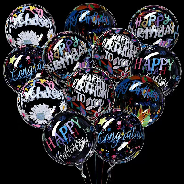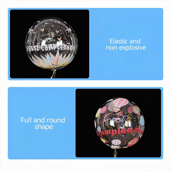 Tištěné všechno nejlepší k narozeninám Bobo Balloon má slova „všechno nejlepší k narozeninám“ a některé návrhy vytištěné na povrchu balónu. Tisk je jasný a jasný. Barva nezmizí. Hlavním rysem designu je jeden kusový formulář. Slova a vzory jsou součástí balónu. Vzhled je dobře a profesionálnější. Tištěný typ přichází s mnoha barvami a mnoha vzory. Jedná se o hvězdy, koruny, poznámky a další tvary. Ukazují hloubku a vrstvy na čirém povrchu balónu. Balón vypadá více a elegantnější. Je to dobré pro skvělou dekoraci večírku.