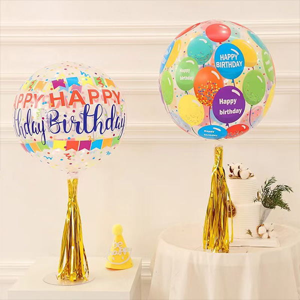 Vložení konfet do transparentního šťastného narozeninového bobo balónu způsobí, že balón vypadá plné pohybu a bohatší na vrstvy. Konfety se pohybují, když se balón pohybuje. Ukazuje lesklý vizuální efekt. Je dobré vytvořit atmosféru večírku, která je jasná a šťastná. Balón může používat jednobarvé kovové konfety nebo mnoho barev smíchaných. Oba způsobují, že balón vypadá modernější a dobře. Může to být klíčový bod pro stěnu pozadí nebo pro oblouk.