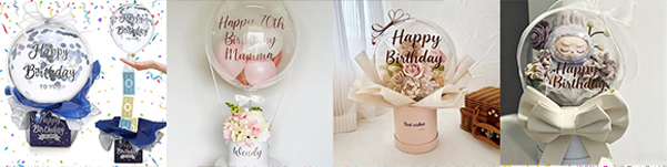 Jedna nebo více růží lze vložit do balónu Bobo. Je to klasický způsob, jak ukázat romantický pocit. Čistý balón je jako kryt. Díky tomu jsou květiny vypadají jasnější a krásnější. Červené růže znamenají vášeň. Růžové růže znamenají měkké a jemné. Vzhled je lepší s LED světly. Je to dobrý dárek pro dívku k narozeninám.