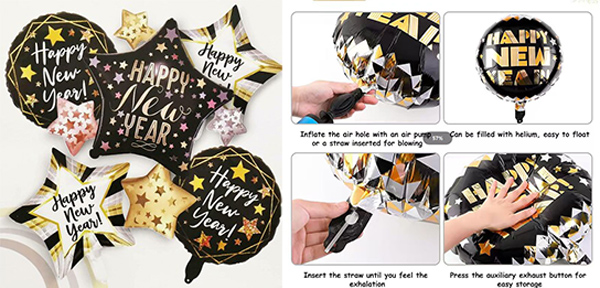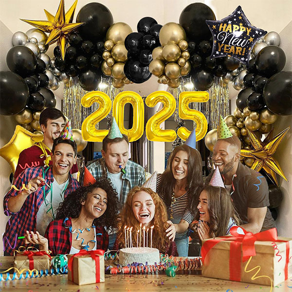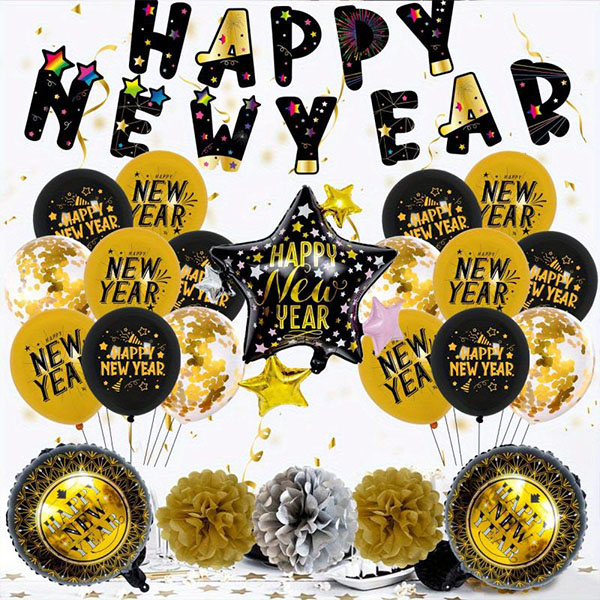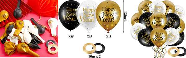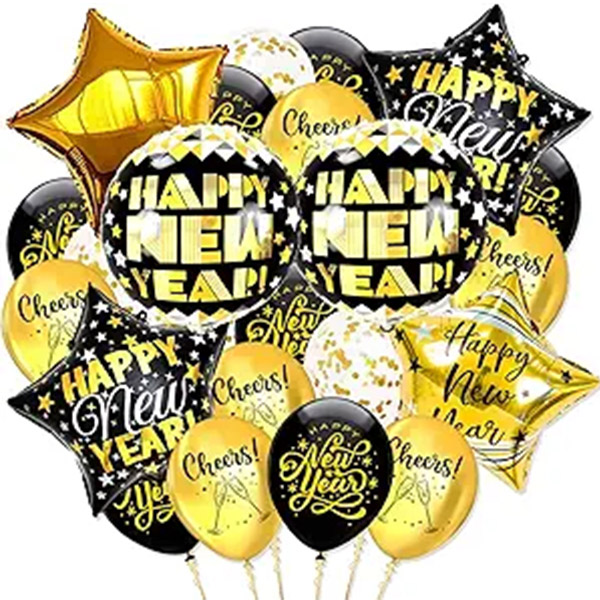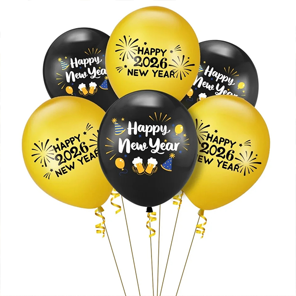 Balónky s novoroční tematikou jsou nezbytnou součástí sváteční výzdoby. Tyto zářivé balónky v černé a zlaté barvě vytvářejí jedinečný slavnostní nádech a přinášejí do novoroční atmosféry radost a styl. Jejich odolná textura odolává deflaci a umožňuje jim zůstat plné po delší dobu. Dají se jimi nafouknoutheliem nebo vzduchem, zachovává si plný, trojrozměrný vzhled. Jsou ideální pro vnitřní i venkovní dekorace.