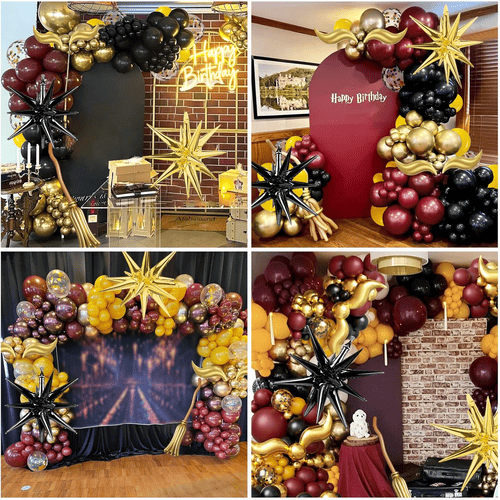 Latexový balónek v balónovém oblouku s motivem Harryho Pottera je vyroben ze 100% surového latexu, který se dováží z jihovýchodní Asie. Jelikož se jedná o přírodní materiál, jsou zcela ekologické a nezávadné pro děti i dospělé. Jejich barvy jsou symbolické barvy filmů o Harrym Potterovi, včetně vínově červené, žluté, černé a zlaté. Pro přidání více vrstev jsme přidali i balónek na konfety, konfety jsou kovově zlaté.