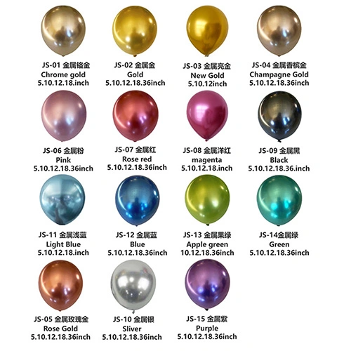 Kovové balónky:Díky vysoce lesklému zrcadlovému povrchu a poutavým texturám a barvám se jedná o nejuniverzálnější latexové balónky pro použití na party dekorace, vlastní tisk a další.