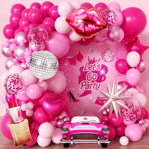 Sady obsahují 5palcové a 12palcové matně růžové latexové balónky, 5palcové a 12palcové perleťově růžové latexové balónky, 5palcové a 12palcové metalické růžové latexové balónky, 5palcové a 12palcové bílé latexové balónky, 12palcové bílé srdíčko růžové konfetové latexové balónky, 18palcové fóliové balónky růžové, 18inch fóliové balónky fóliový závěs, růžové fóliové balónky Happy Birthday, motýlkové dekorace a doplňky, jako jsou lepicí tečky, proužky balónků a stuha.
