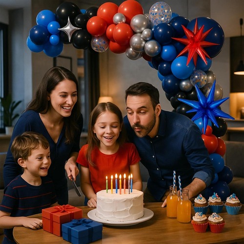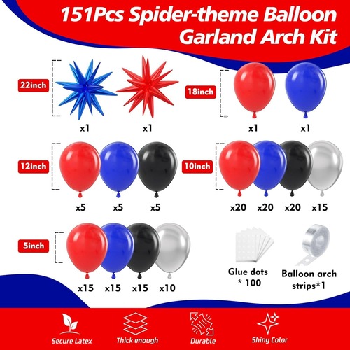 Hlavní barvy balónového setu jsou modrá, červená a černá. Výrazné tři barvy vám umožní představit si skvělou figurku Spider-Mana z filmu. Latexové balónky v této sadě včetně matně červeného balónku, matně modrého balónku, matně černého balónku a kovového balónku. Fóliový balónek v této sadě je fóliový balónek s exploze hvězdou, barva je modrá a červená.