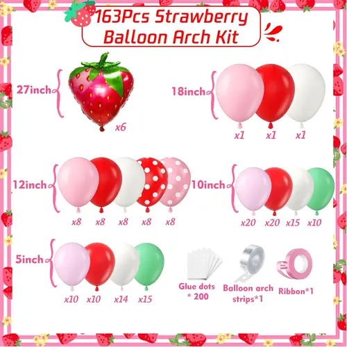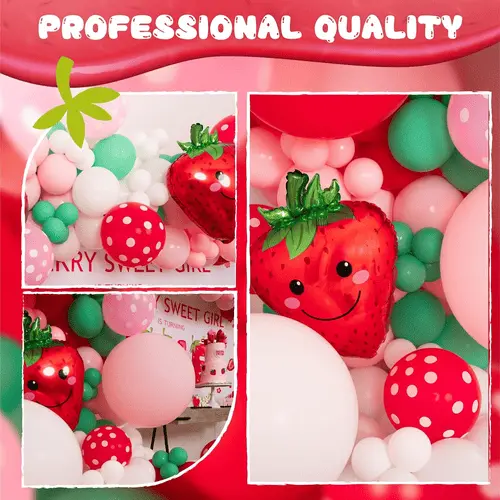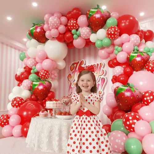 Balónková girlanda s motivem jahod se skládá z vysoce kvalitního latexového balónku a fóliového balónku. Nejvýraznější položkou v sadě je 27palcový fóliový balónek s jahodami. Kromě toho jsou důležitou součástí i latexové balónky v ní. Latexové balónky v sadě jsou různých barev a velikostí, které dokážou vytvořit nádherné vrstvy. Barva latexového balónku je macarronově růžová, matná červená, matná tmavě růžová, retro slonovinová bílá.