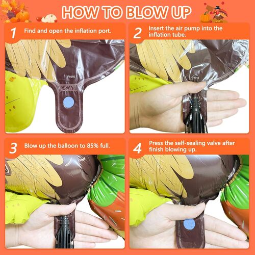 Fóliové balonky Díkůvzdání se budou velmi snadno nafukovat a uzavírat. K nafouknutí můžete použít ruční pumpu nebo elektrickou pumpu a poté ji utěsnit samolepicím lepidlem, které je na trysce každého balónku. Po utěsnění se balónek stane pevným.