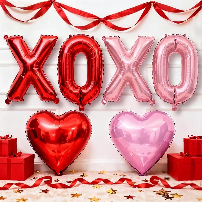 Romantická sada na Valentýna: Středem je fóliový balónek "XOXO fóliové balónky", spárovaný s balónkem ve tvaru srdce, latexovým balónkem s flitry a zdobený stuhami a lepicími tečkami. Celkový design je plný sladkého dechu, dokonale padnoucí svatby, svatby, zpovědi a dalších romantických scén, přesně tak, aby vyhovovaly spotřebitelským potřebám párů.